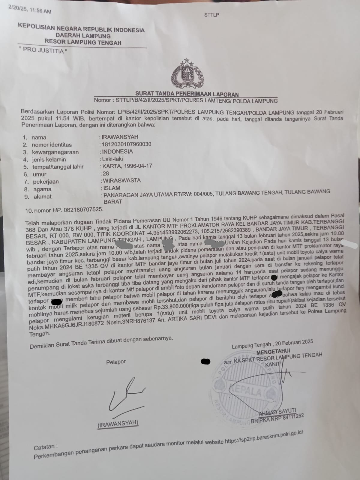 Diduga Irawansyah Debitur Nasabah Perusahaan Mandiri Tunas Finance Bandar Jaya Merasa Ditipu Dirinya Lapor Polisi
