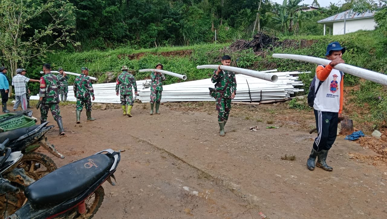 Kodim 0306/50 Kota Bersama Warga Perbaiki Saluran Air Pamsimas Pasca Bencana