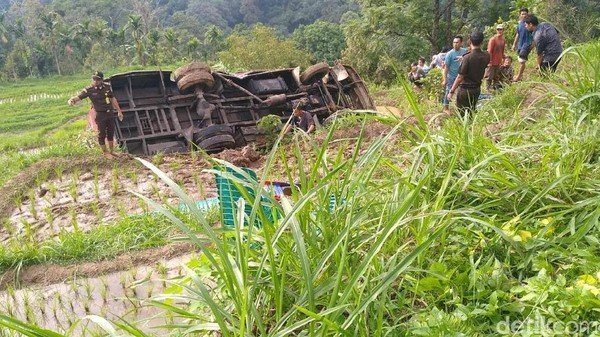 Bus tersebut mengalami kecelakaan tunggal teeperosok ke jurang sedalam 20 meter. Jurang itu ada di jalur menuju Kabupaten Pacitan, Pacitan, Jawa Timur. Kejadian itu, Sabtu (21/12).
