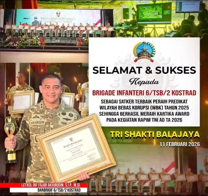Raih Penghargaan Kartika Award, Brigif 6/TSB/2 Kostrad Torehkan Prestasi Sebagai Satker Terbaik Peraih WBK