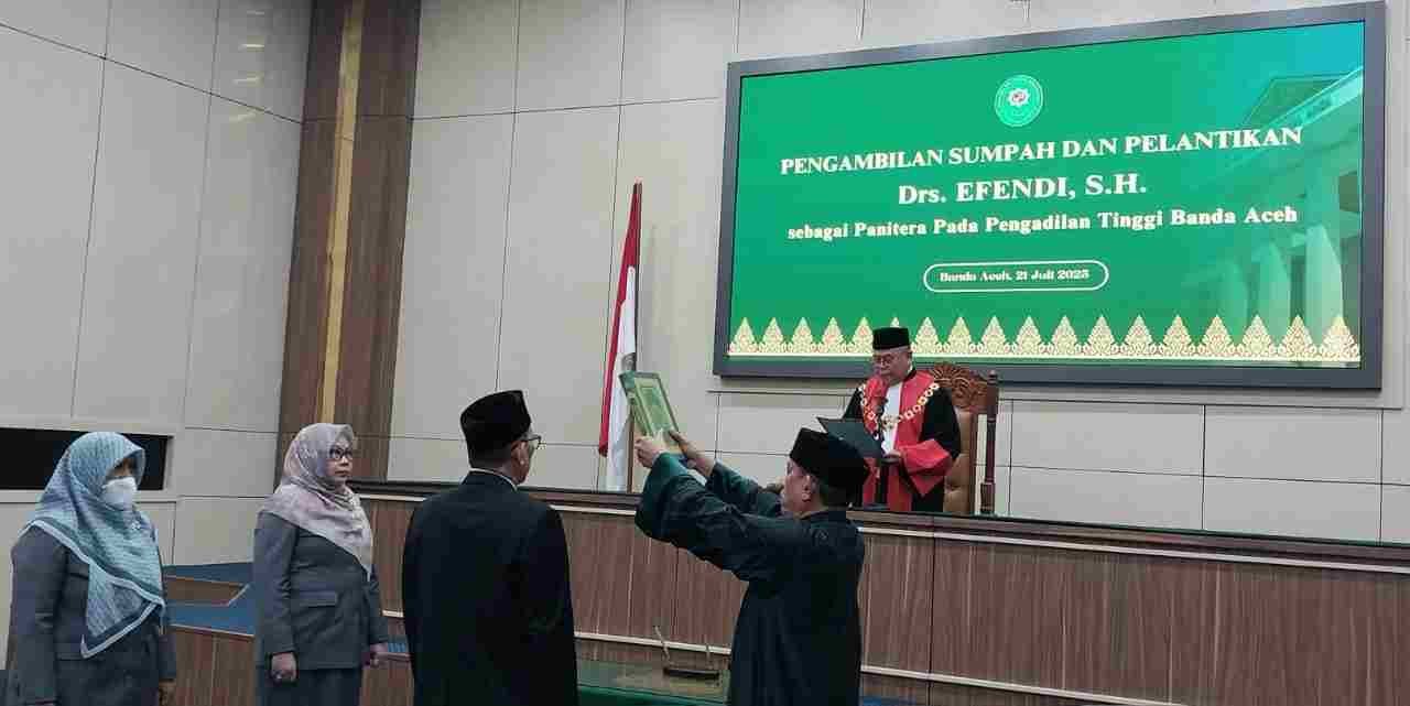 Mentreng.com | Banda Aceh, Senin, 21/7/2025 – Ketua Pengadilan Tinggi Banda Aceh, Nursyam, SH, MH, Senin 21 Juli 2025 di Ruang Sidang Utama Pengadilan Tinggi Banda Aceh melantik Drs Efendi, SH sebagai Panitera Pengadilan Tinggi Banda Aceh.