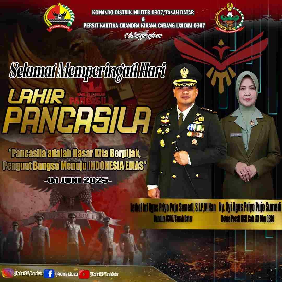 Komandan Kodim 0307/Tanah Datar Letkol Inf Agus Priyo Pujo Sumedi, S.I.P., M.Han, menyampaikan bahwa peringatan Hari Lahir Pancasila bukan sekadar kegiatan seremonial, tetapi harus menjadi momentum untuk memperkuat kembali semangat persatuan dan kesatuan bangsa.