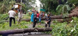 Sekarang masih dilanjutkan dengan penebangan dua buah pohon tg labil yg diperkirakan akan tumbang juga dan berakibat apabila tumbang akan menimpa warung dan rumah masyarakat.(*)