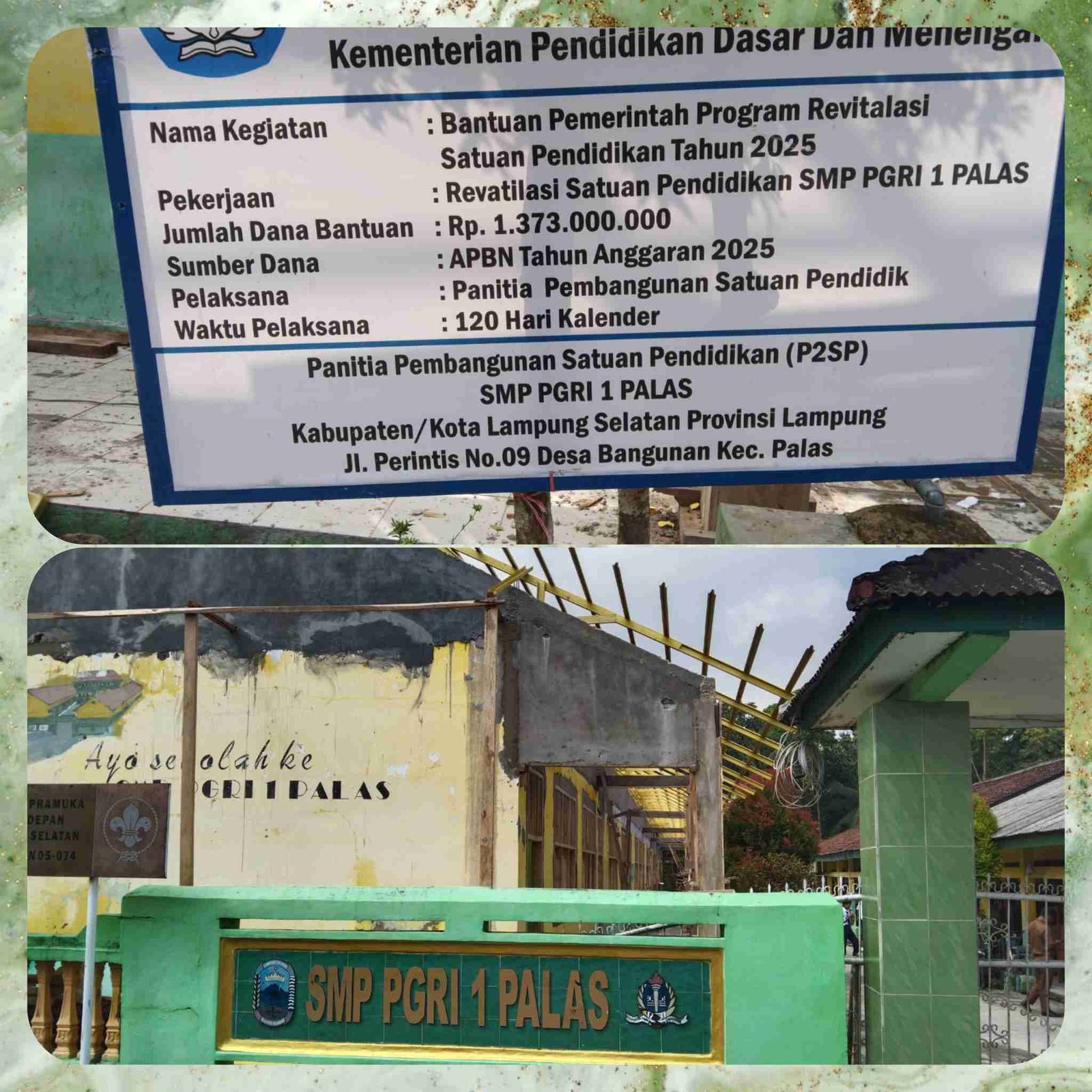 Mentreng.com  |  Palas, Lampung Selatan – Kepala sekolah SMP 1 PGRI kecamatan Palas kabupaten Lampung Selatan Gumilang Riadi S.KOM Mengatakan,Untuk pengabdian saya yang sudah 27 tahun ini alhamdulillah kami ucapkan banyak terimakasih khususnya kepada Presiden Prabowo Subianto,dimana telah terealisasinya program strategis nasional untuk renovasi revitalisasi satuan pendidikan tahun 2025 ini dan telah berjalan sebagaimana mestinya.25/09/2025