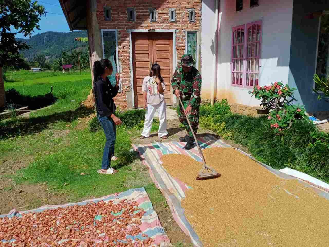 Manfaatkan Waktu Luang, Satgas TMMD Reguler ke-124 Kodim 0306/50 Kota Bantu Warga Jemur Padi